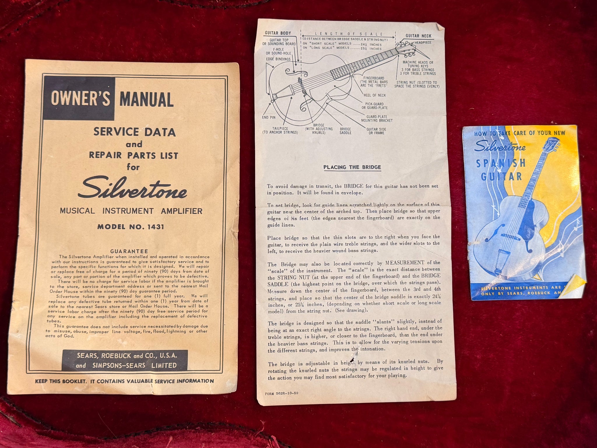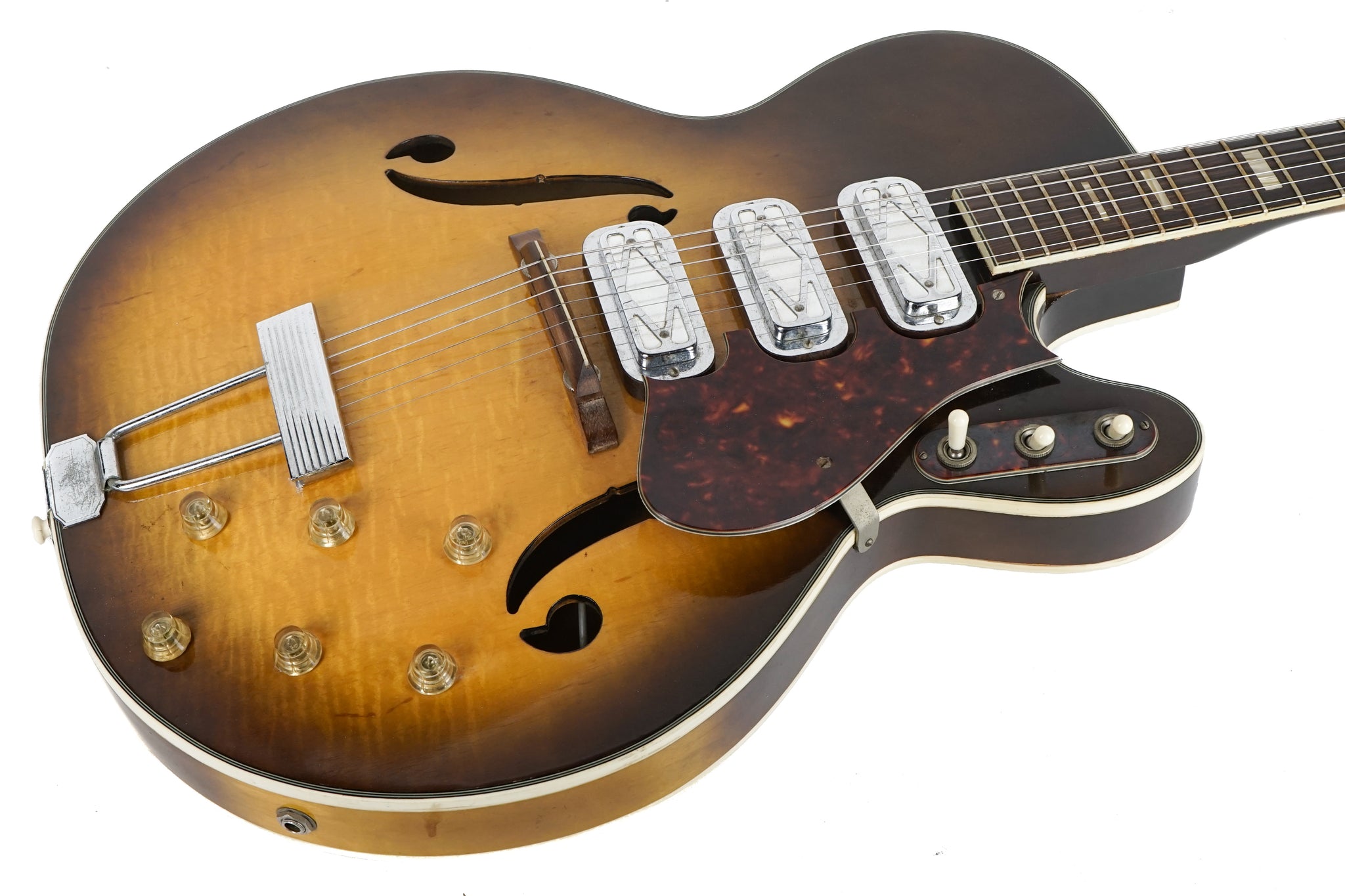 Up for sale is a beautiful 1960 Silvertone H-1429 in its original sunburst finish. This is one of my personal favorite models from the Harmony / Silvertone line and this example is in great shape. 3 original gold foil pickups w/ independent volume & tone controls and on / off switching, trapeze tailpiece, tort guard and a rounded neck profile. Overall this one is in very good condition but does show some finish wear on the body and neck as well as a small superficial crack located near the body neck pocket screw holes. Pro setup in house and comes complete with its original soft case. Weight: 6lbs. 9oz.