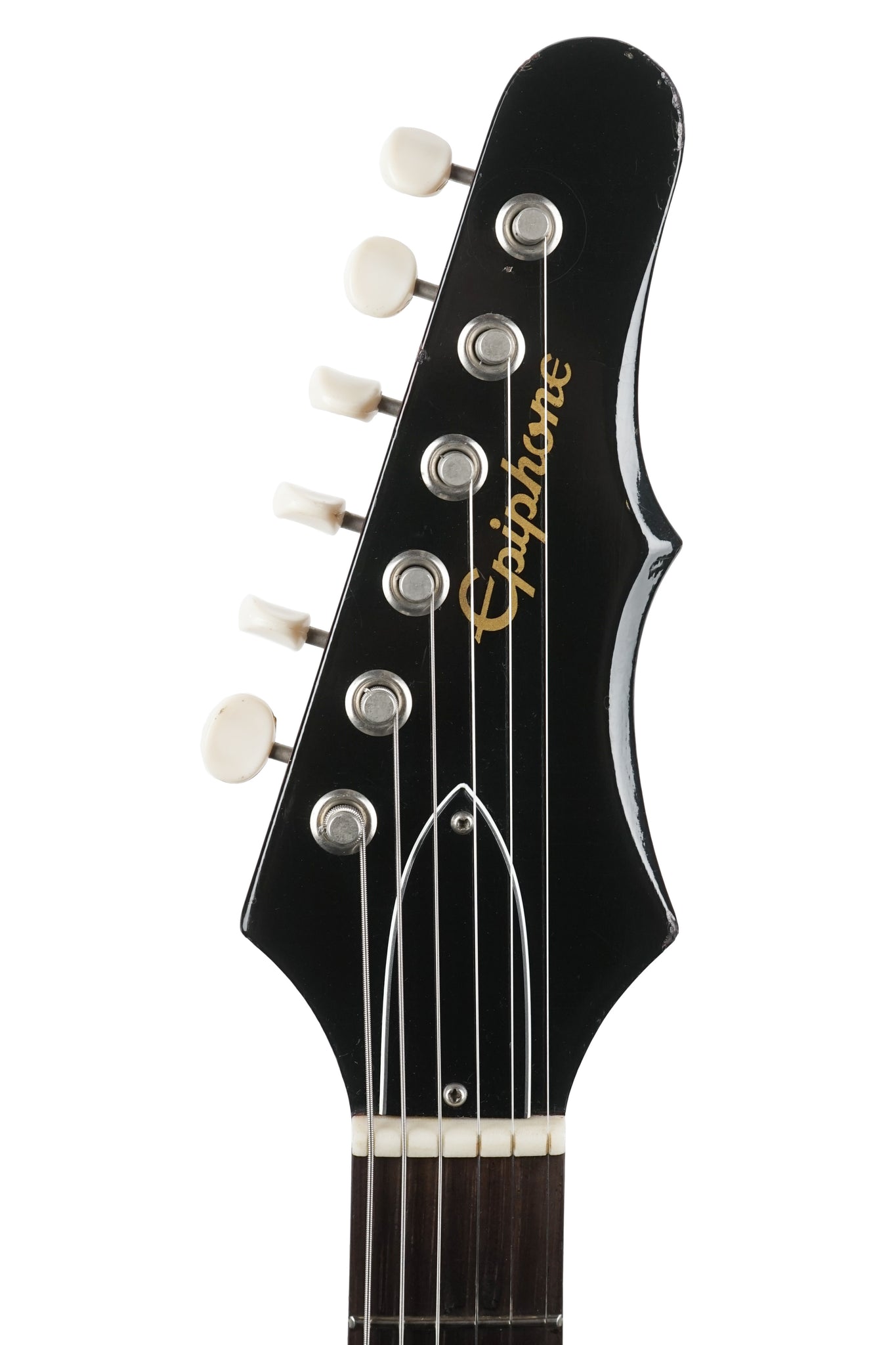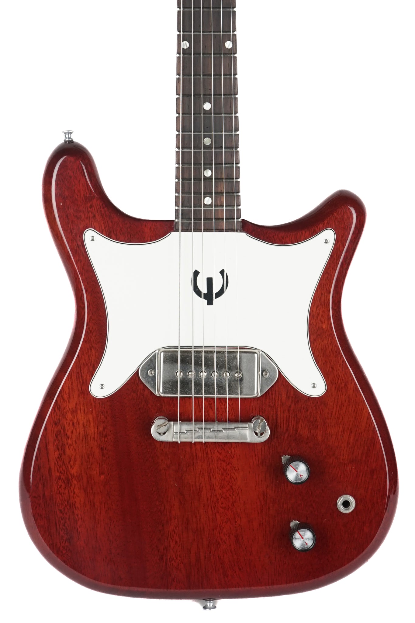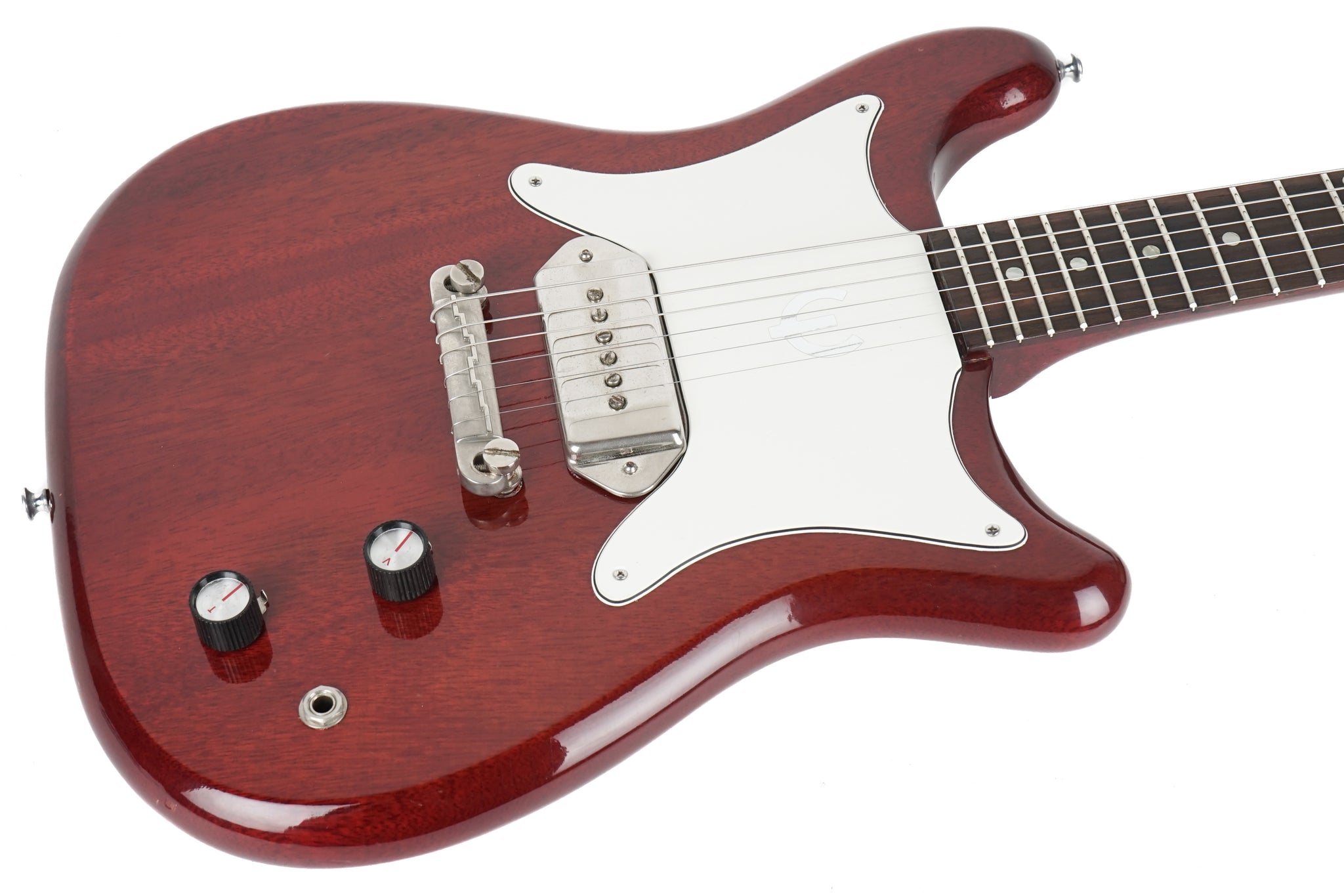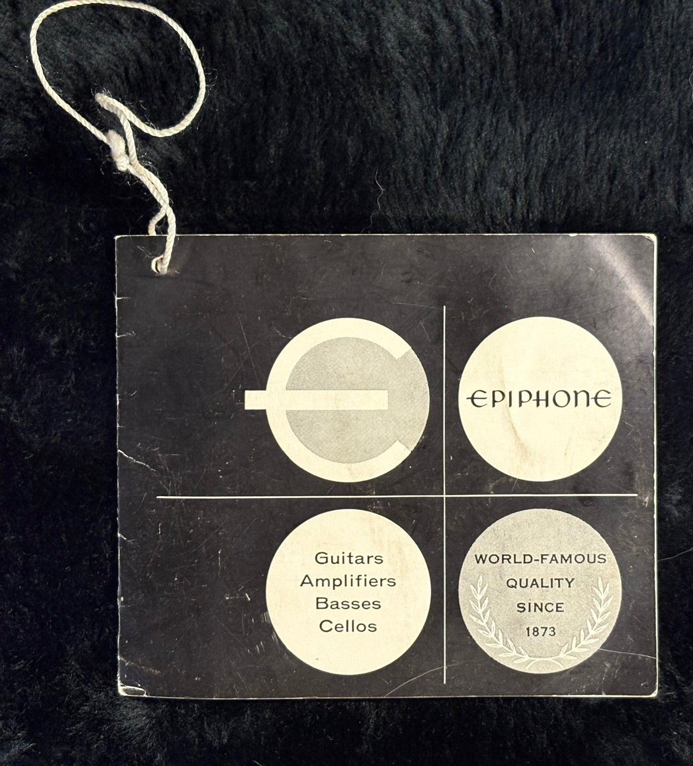 Up for sale is a killer 1965 Epiphone Coronet in its original and vibrant cherry finish. This example is in great shape and plays wonderfully. This one features a bat-wing headstock, 1 9/16th nut width, nickel hardware, Kluson double line tuners and a screaming single dog-ear P90. There is a very small and stable stress crack on the treble side of the neck pocket which is reflected in our asking price. The bridge has been changed to Mojo Axe and the guitar has a recent pro refret and bone nut. Original bridge is in the case. Hang tags included. Pro setup in house and ships with a non original hardshell case