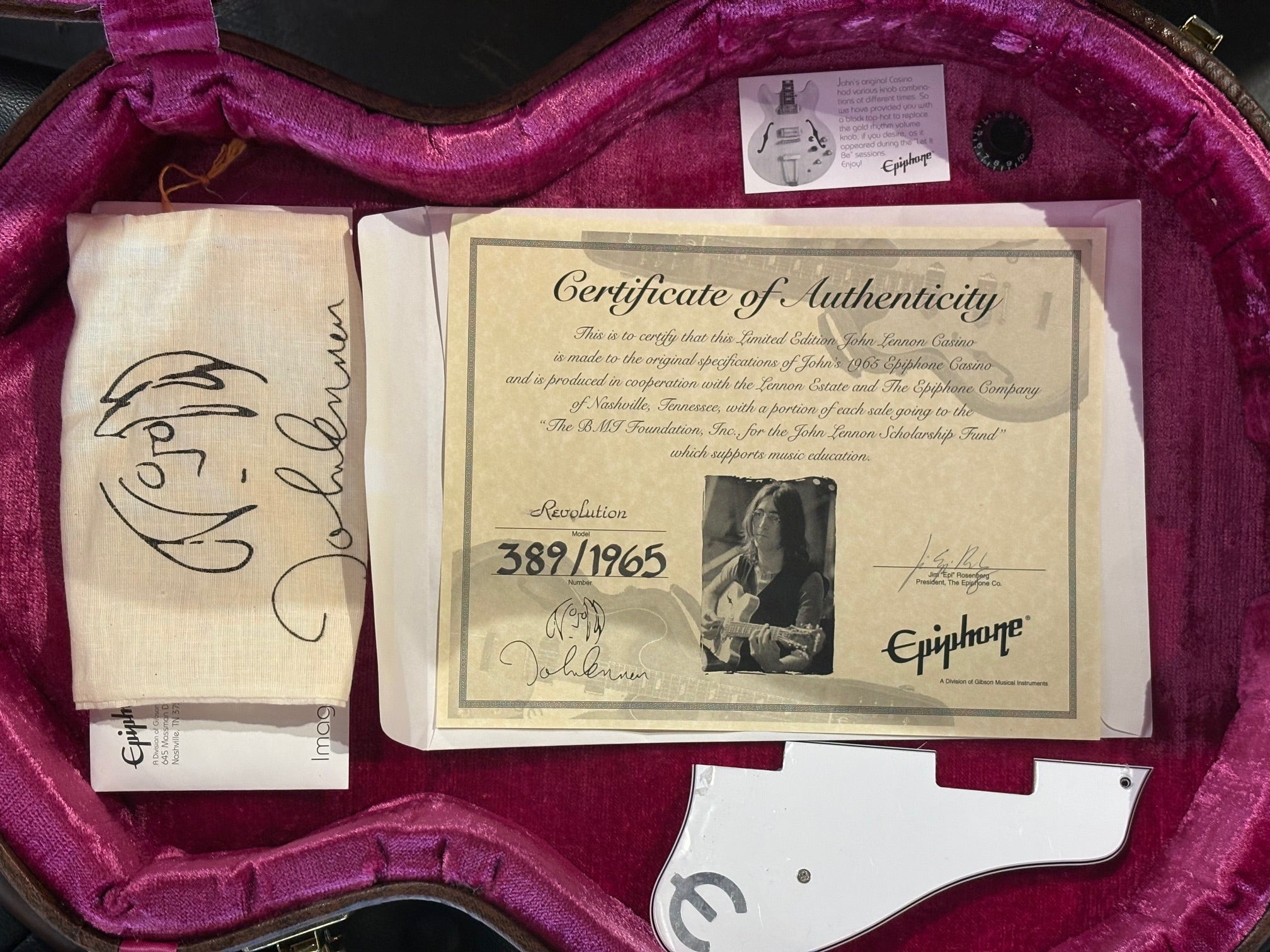 Up for sale is a clean 2008 Epiphone John Lennon Revolution Casino Natural Limited Edition, #389 of 1965 in natural. If you're a Lennon fan and love Casinos THIS is the guitar for you! Overall in excellent condition less some pick wear, faint signs of play wear and light hardware tarnish on the pickup covers. Included in the paperwork shown in our photos, COA and an original hard case (some light wear). Weight: 6lbs. 7oz.
