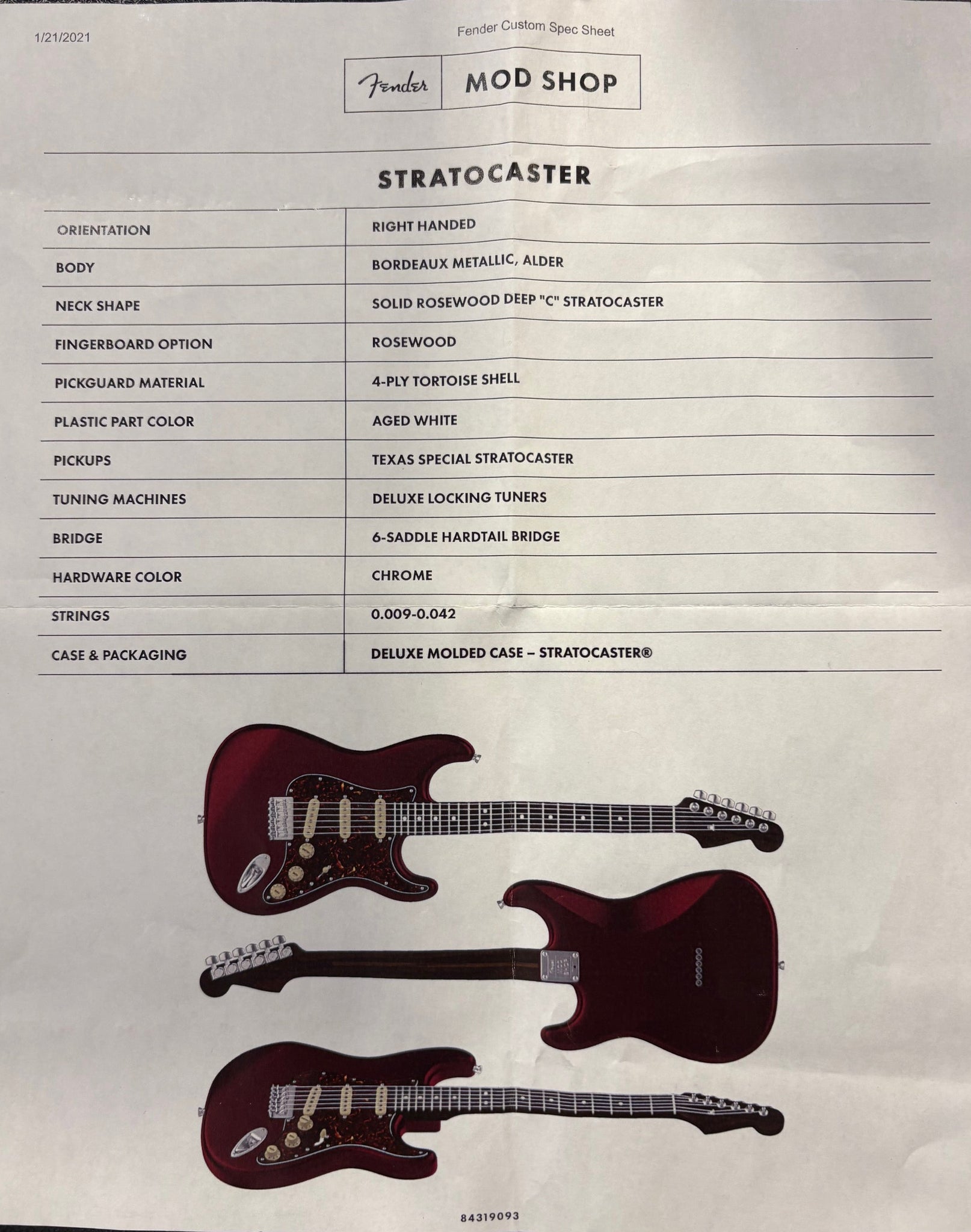 Up for sale is a 2020 Fender Mod Shop Stratocaster in Bordeaux Metallic. I've never met a hard tail Strat that I didn't like! This one comes to us from the home of the previous owner in very good condition less some minor cosmetic play wear. Notably some pick wear on the guard - to be expected though from a 5 year old instrument. The frets show little to no wear on this one. Anyone looking to add a unique Stratocaster to their collection should consider this one.