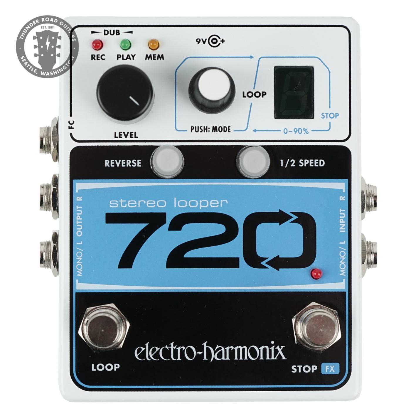The EHX 720 Stereo Looper is a powerful looping tool with 12 minutes of stereo recording time, 10 loop memory banks, and creative performance functions. Its simple-to-use design makes it an easy and effective to use in both live and practice situations.