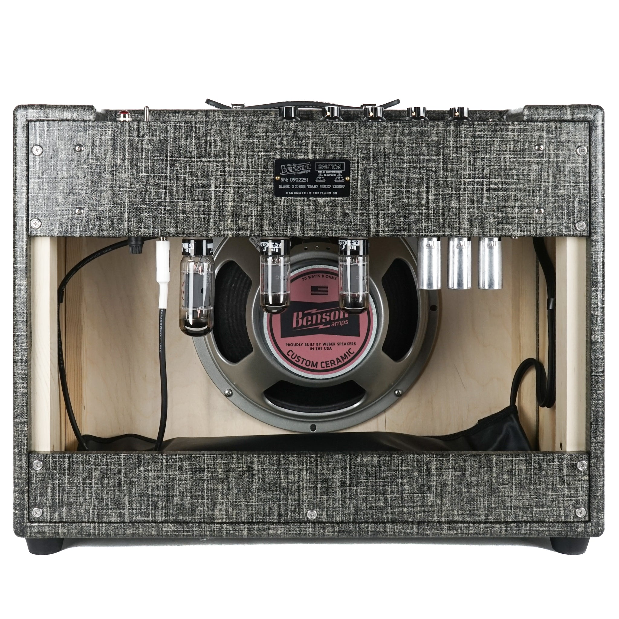 2 x JJ 6V6 power tubes, 2 x JJ 12AX7 preamp tubes, JJ 12DW7 reverb driver and a JJ 6L6GC set up as a voltage regulator for power scaling.