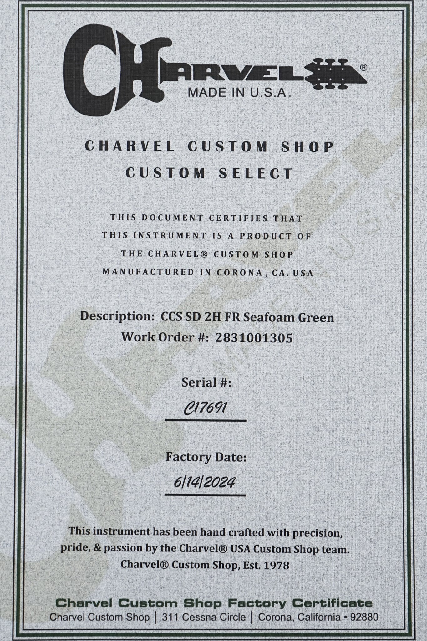 Up for sale is an absolutely stunning New Charvel Custom Shop San Dimas 2H FR in Seafoam Green. This guitar was well worth the wait and we are all geeking out over it! Pro setup in house and comes complete with its original case and paperwork.