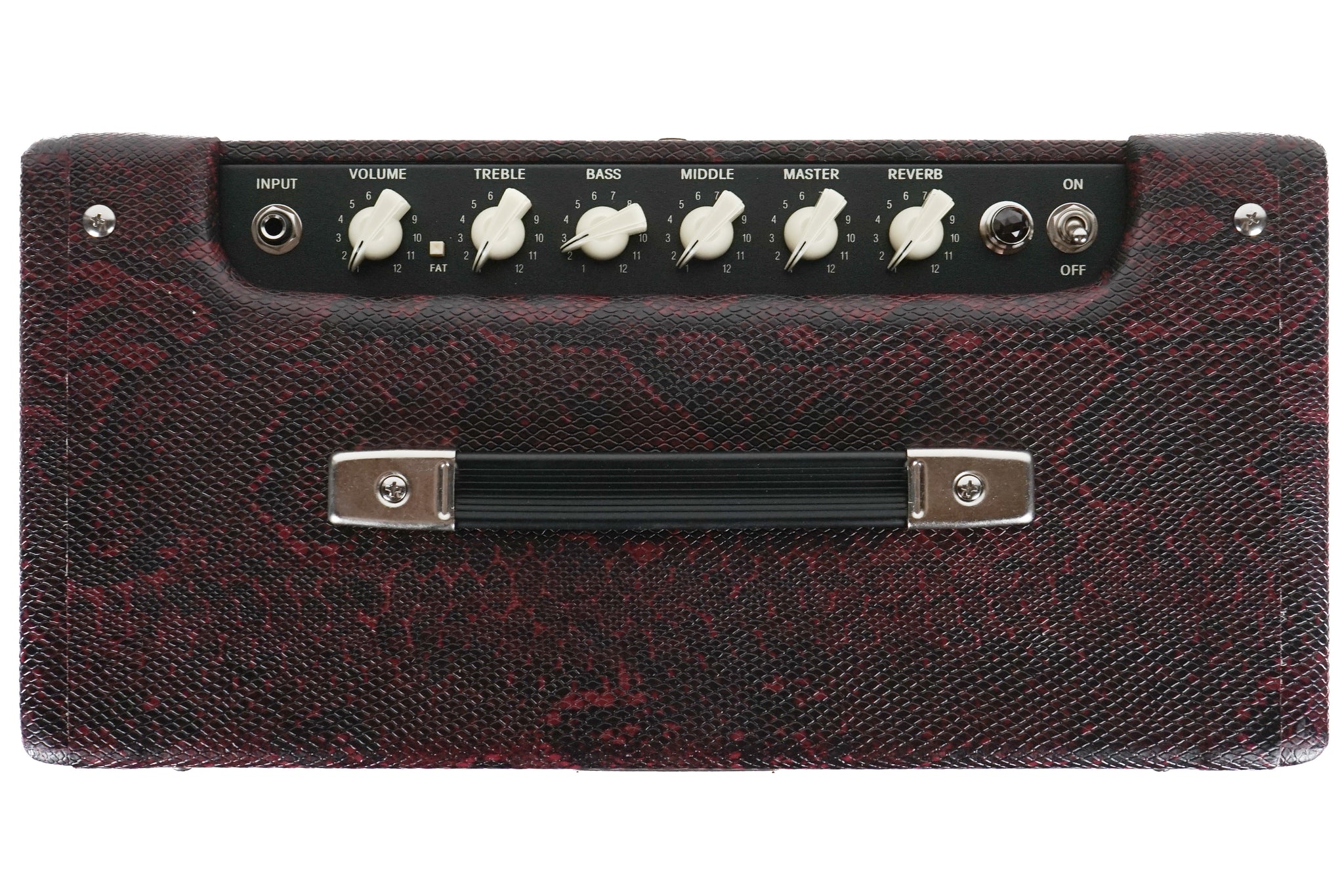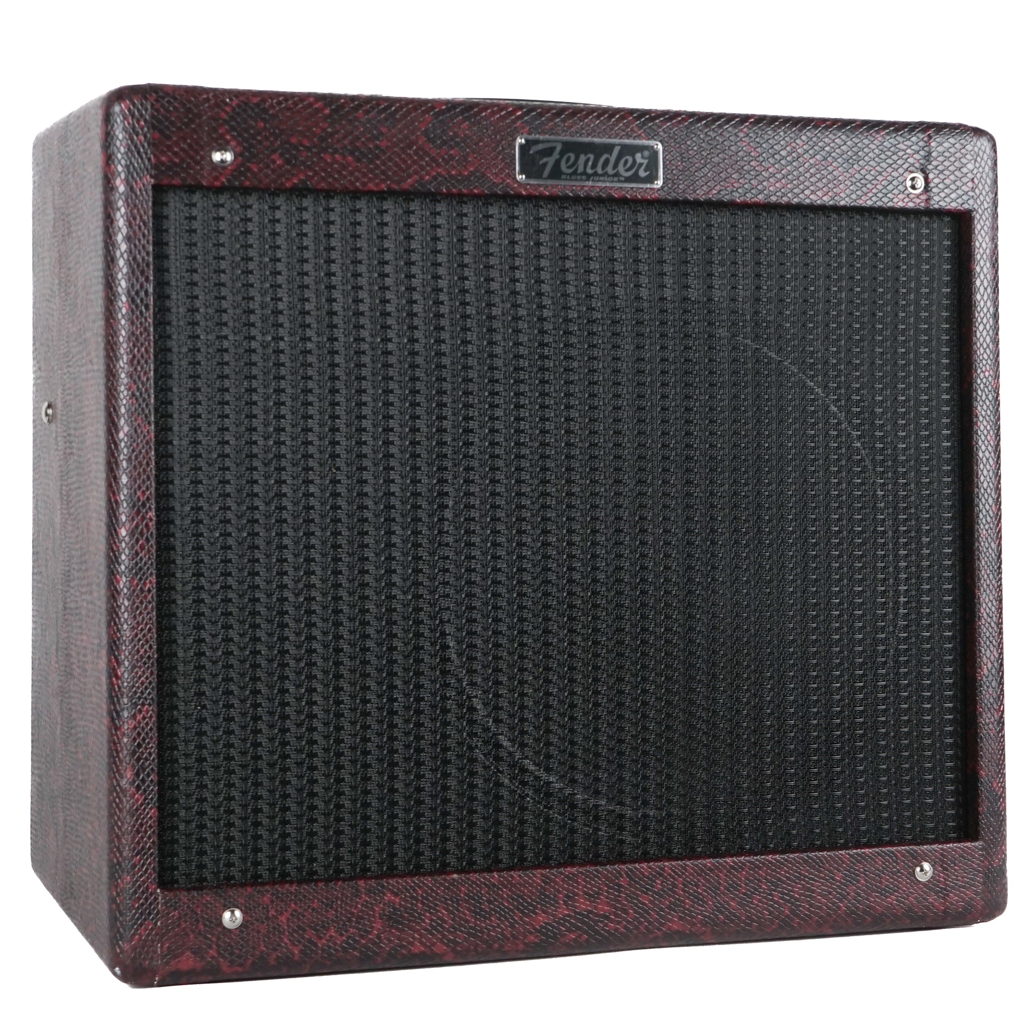 Fender Special Run (FSR) model of the Blues Junior IV, a 15-watt, all-tube combo amplifier featuring a striking red snakeskin vinyl finish, an Eminence Texas Heat 12-inch speaker for a bold, warm tone, and a refined preamp circuit for enhanced clarity and smoothness.