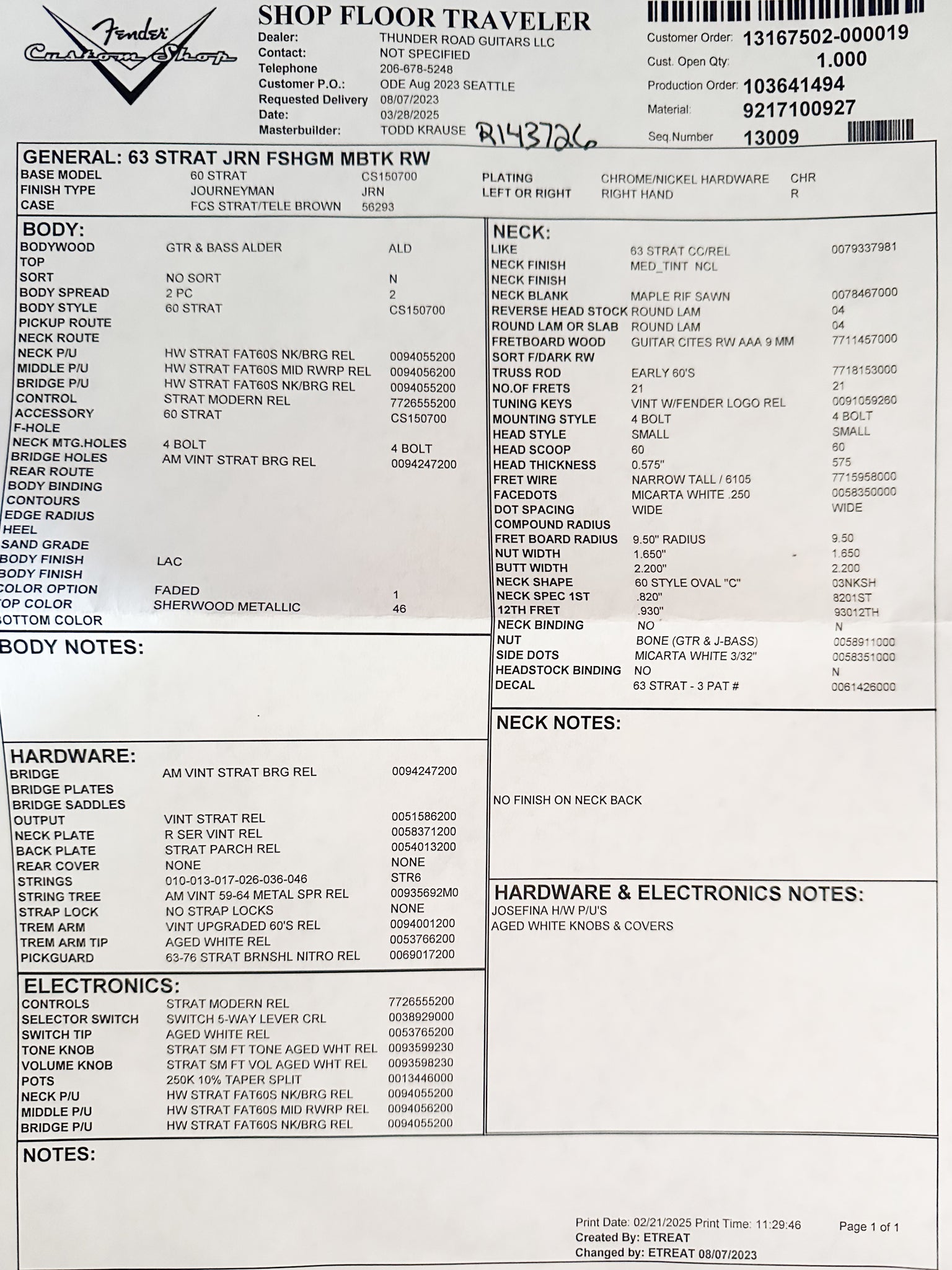 Up for sale is a New Fender Custom Shop Todd Krause Masterbuilt '63 Stratocaster in Faded Sherwood Green Metallic, Journeyman Relic. We are an authorized Fender Custom Shop Showcase Dealer and have one of the largest selections of Fender Custom Shop instruments in stock in the Pacific Northwest. For a full list of specs please see the build sheet photo in our ad. Weight: 7lbs. 9oz.