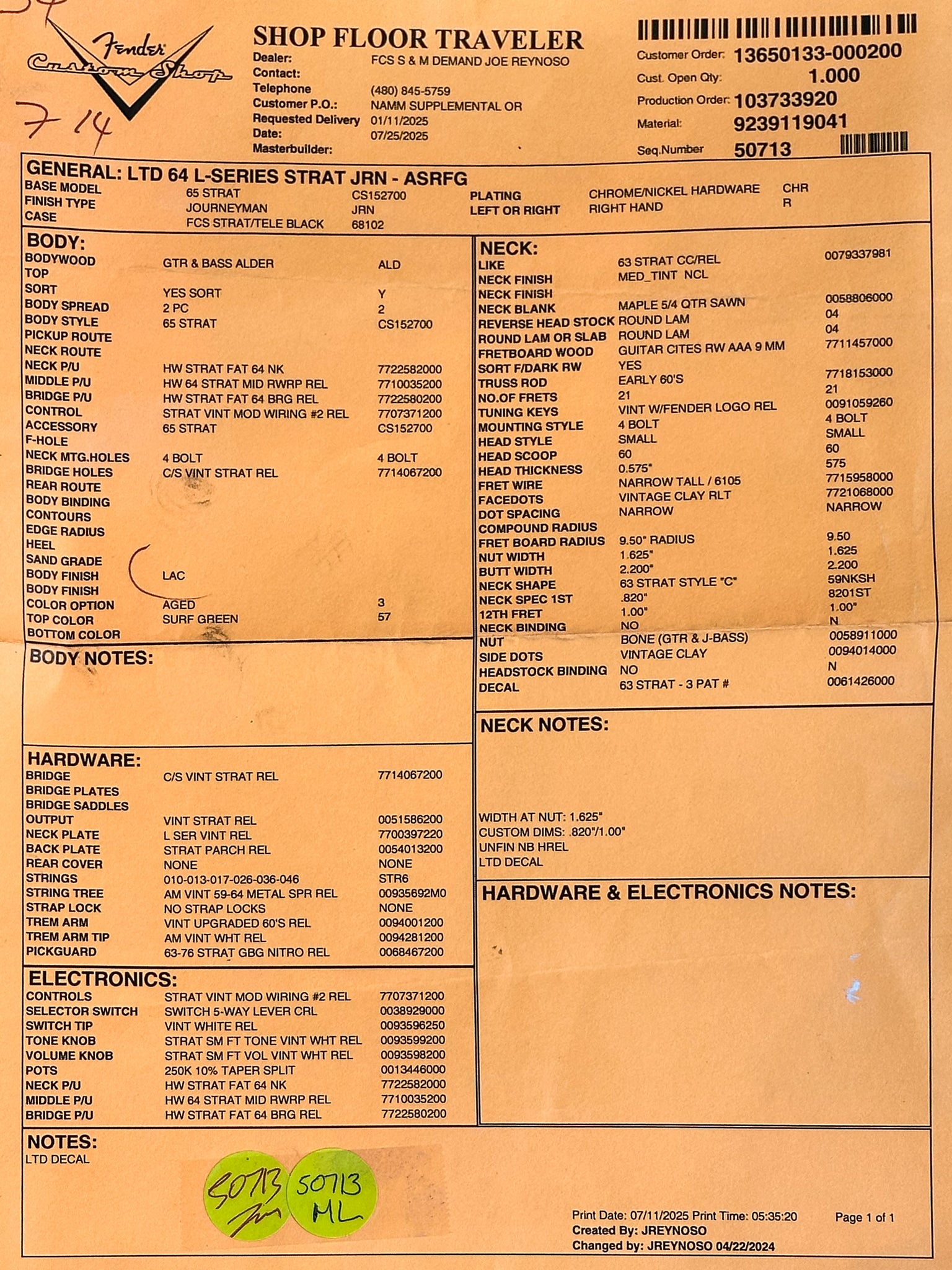 Up for sale is a New Fender Custom Shop '64 Stratocaster Journeyman Relic in Aged Surf Green. We are an authorized Fender Custom Shop Showcase Dealer and have one of the largest selections of Fender Custom Shop guitars in the Pacific Northwest! For a full list of specs please see the build sheet photo in our ad. Weight: 7lbs. 14oz.