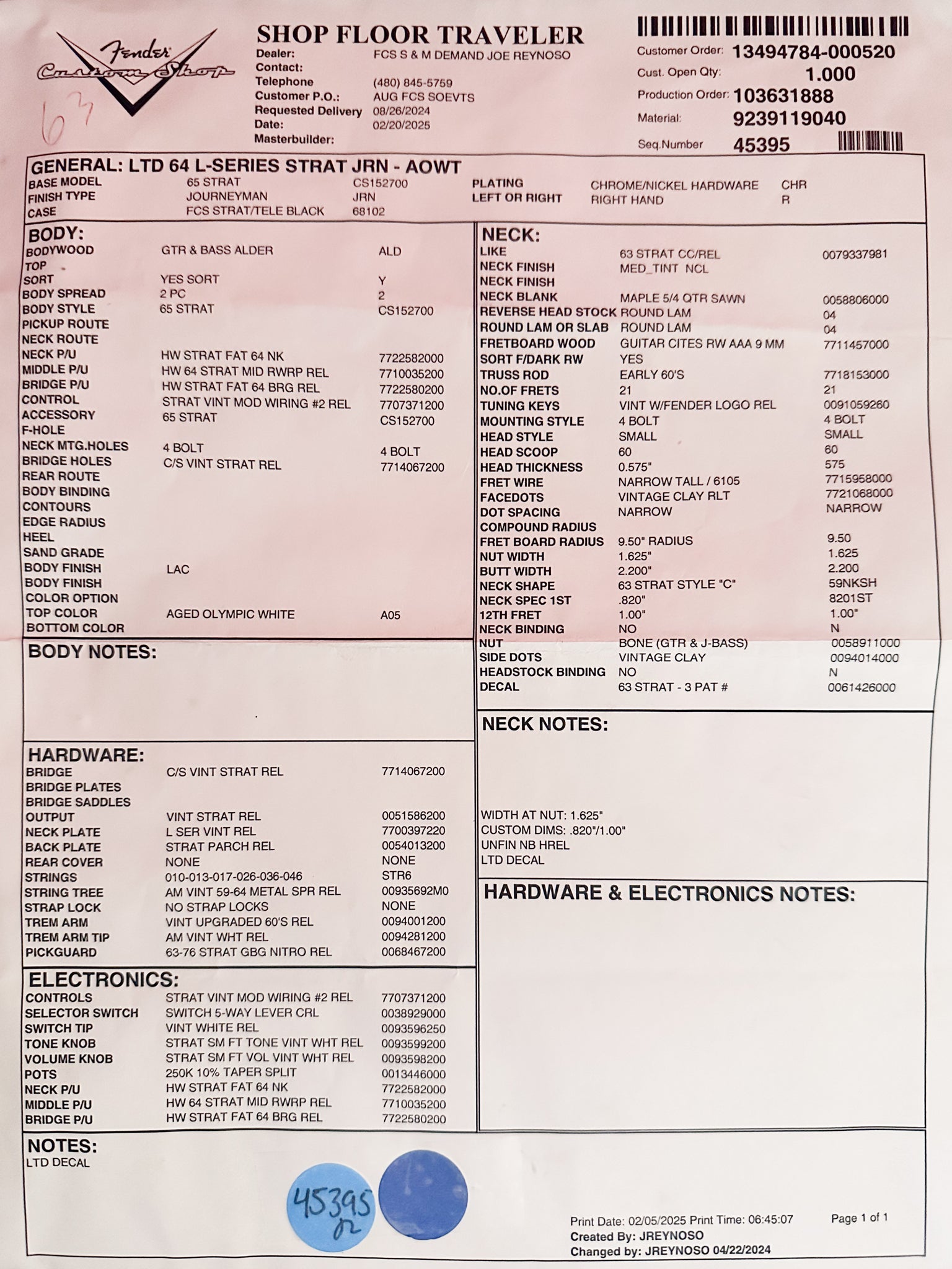 Up for sale is a New Fender Custom Shop LTD '64 L-Series Stratocaster Journeyman Relic Aged in Olympic White. We are an authorized Fender Custom Shop Showcase Dealer and have one of the largest selections of Fender Custom Shop instruments in stock in the Pacific Northwest. For a full list of specs please see the build sheet photo in our ad. Weight: 7lbs. 11oz.