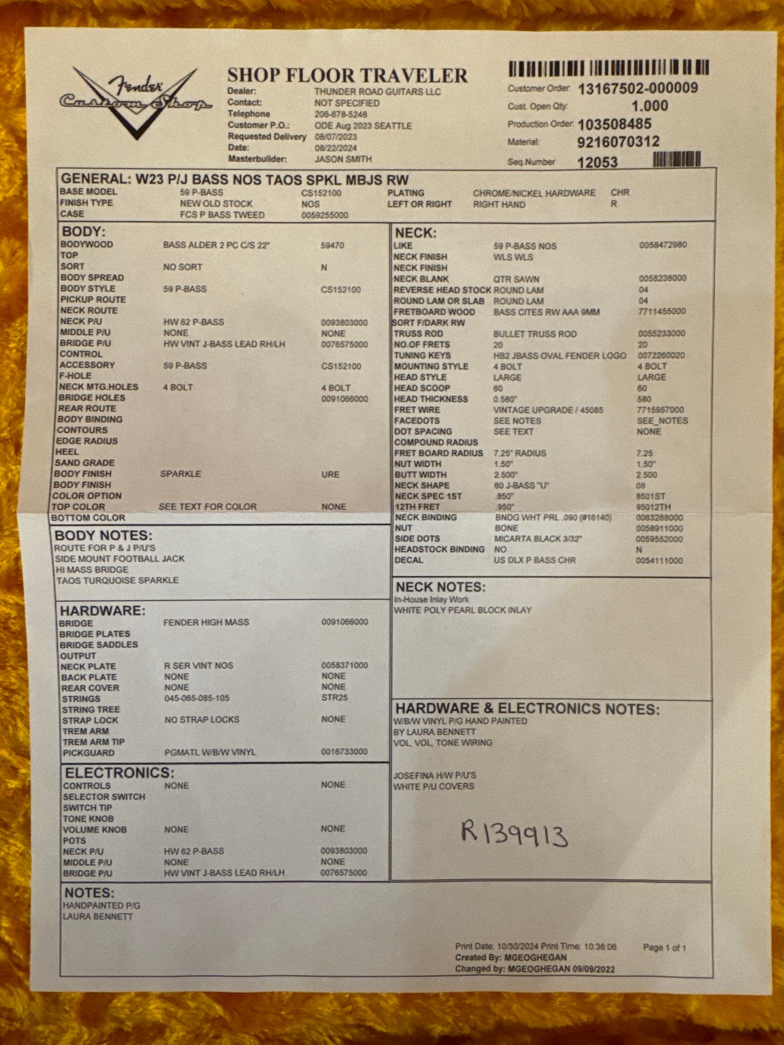 Up for sale is a Stunning 2024 Fender Custom Shop Masterbuilt Jason Smith P/J Bass NOS in Taos Turquoise Sparkle. This bass is truly a sight to behold and features a hand painted pick guard by the artist Laura Bennett. We are an authorized Fender Custom Shop Showcase Dealer and have one of the largest selections of Custom Shop Fenders in the Pacific Northwest. For a full list of specs please see the build sheet photo in our pics.