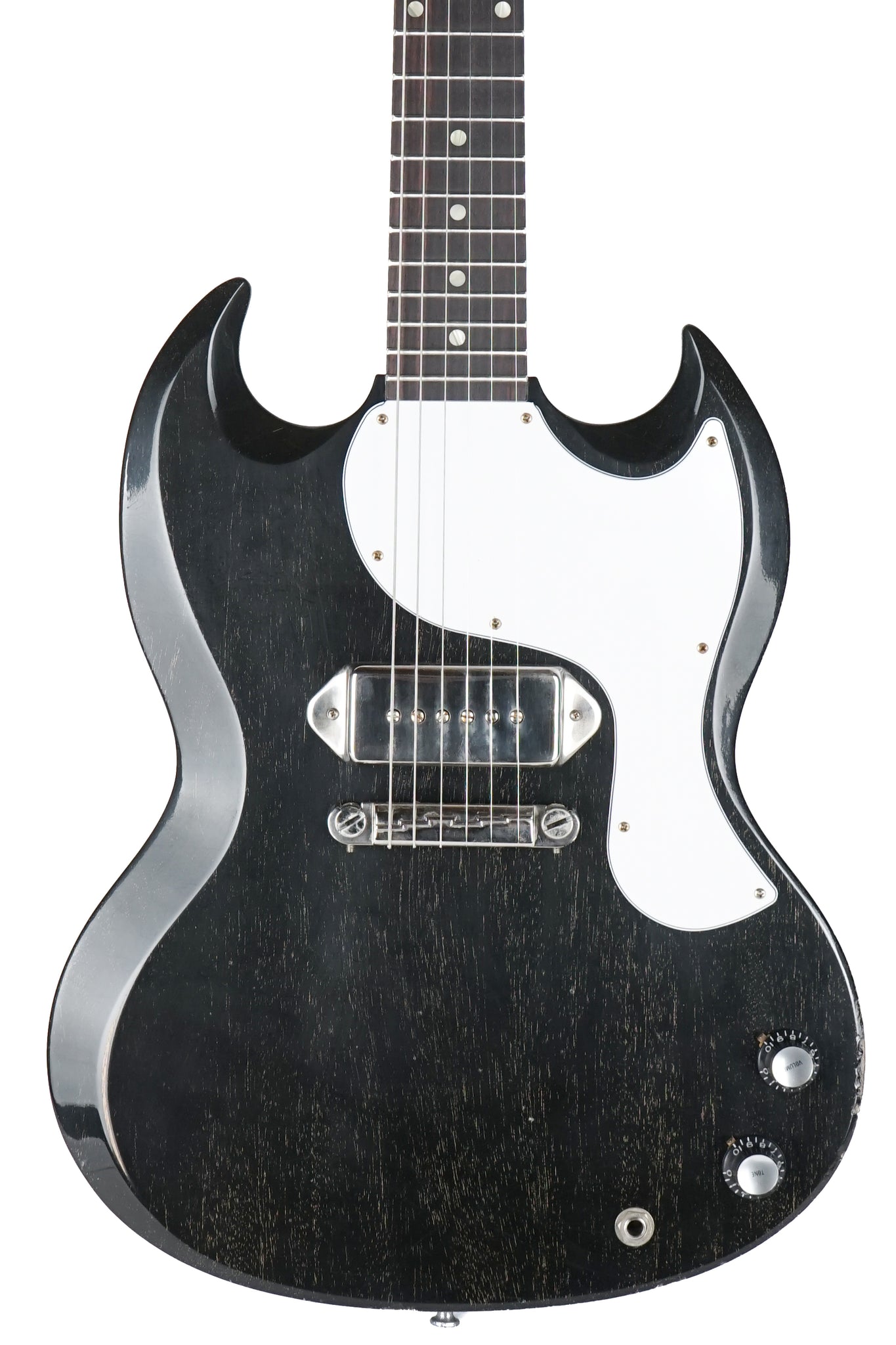 A premier, off-the-price-list showpiece from the Gibson Custom Shop, this Dealer Select 1963 SG Junior is the ultimate sonic weapon for high-octane garage punk, sizzling electric blues, and a variety of other rough-and-ready playing styles. This solidbody electric guitar is built around a solid slab of mahogany, meticulously carved into the iconic SG shape, and finished in a spotlight-stealing Silver Fox color with a lightly aged nitro finish, expertly crafted by the renowned Murphy Lab. This guitar offers a sublime playing experience, thanks to its ’61 SG-shaped neck profile and 22-fret rosewood fingerboard adorned with cellulose dot inlays. This no-nonsense, single-pickup wonder boasts a covered dog-ear P-90, providing a unique sonic flavor that’s impossible to resist. This guitar’s hardware will delight any Kalamazoo aficionado; it features a lightning bar wraparound bridge and white-button tuning machines, along with a period-correct white plastic pickguard and black top hat knobs with silver foil inserts. This must-see 1963 SG Junior offers die-hard Gibson devotees a rare chance to score this classic model from the company’s legendary Custom Shop.