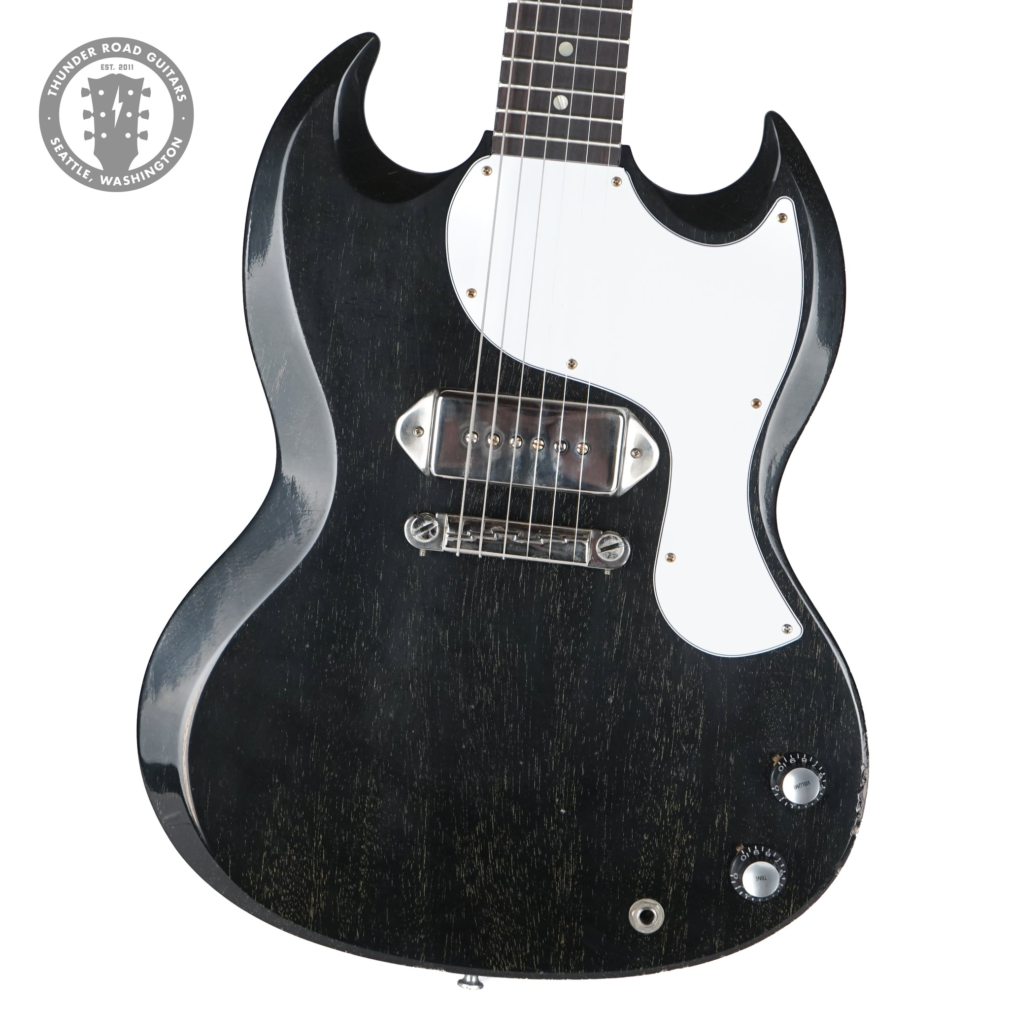 Up for sale is a New Gibson Custom Shop Dealer Select 1963 SG Junior Lightning Bar Silver Fox Murphy Lab Light Aged. This guitar is a total ripper and is based off a mid 60s Epiphone Silver Fox Coronet. Weight: 6lbs. 11oz. Model info below: