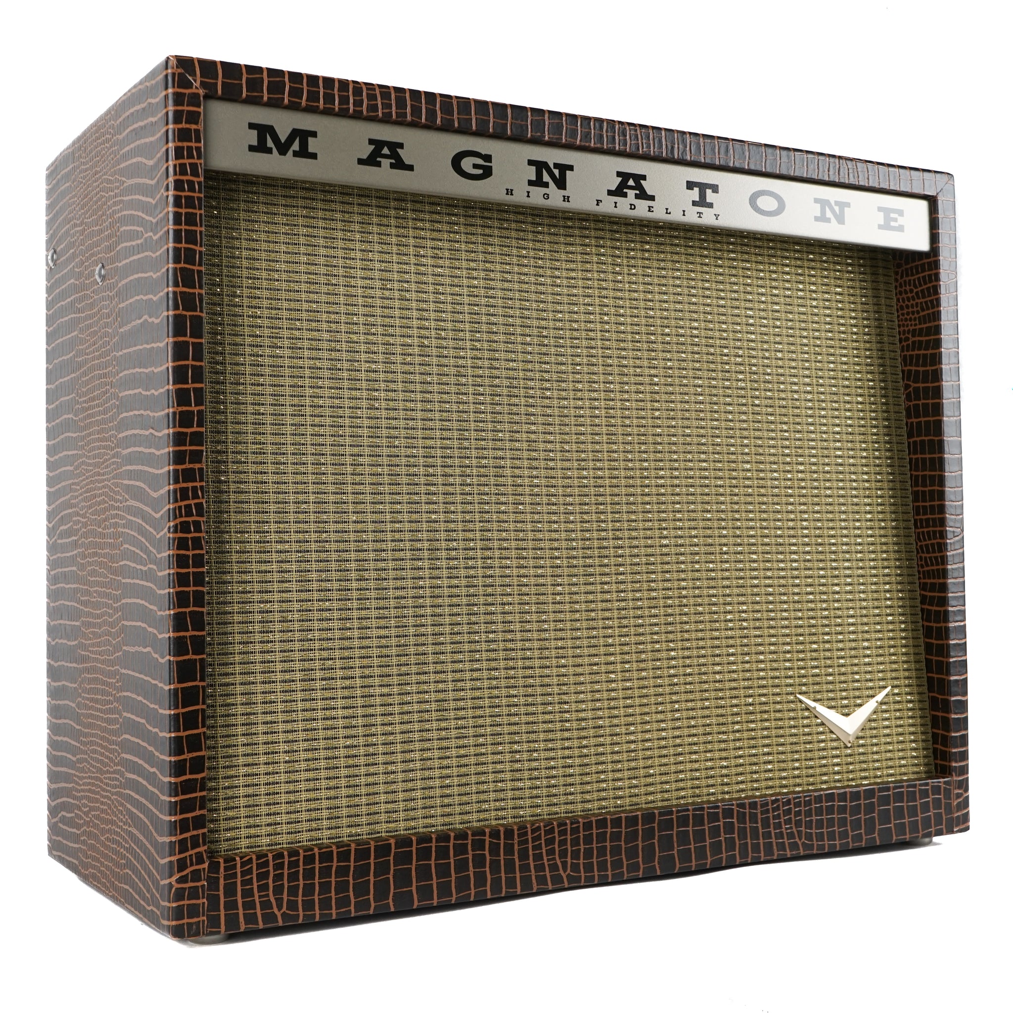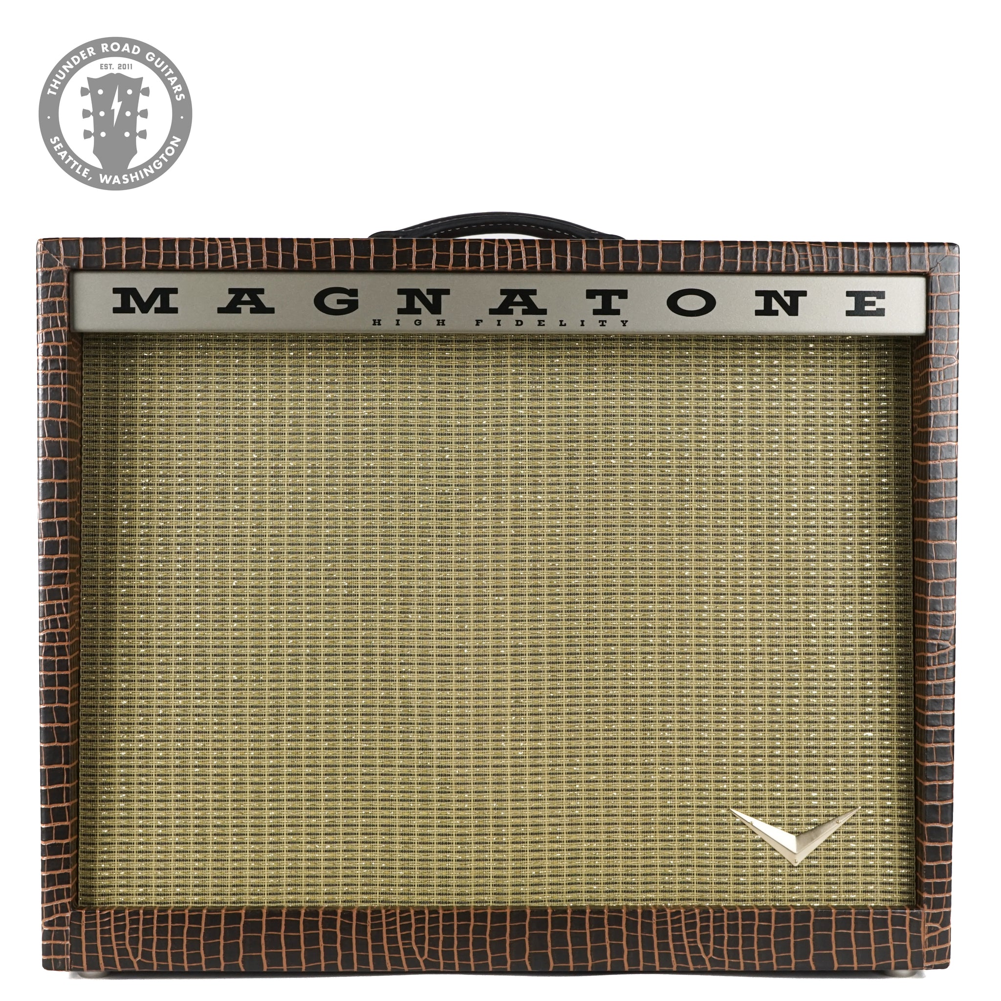 Up for sale is a New Magnatone Twilighter Combo Amp. This amp is killer and comes in a Thunder Road Exclusive Colorway of Brown French Alligator Tolex and a Gold Stripe Grill. This amp looks absolutely stunning in person and sounds even better. Thunder Road Guitars is Washingtons only Magnatone dealer and we could not be more proud. Come by and give this one a spin!