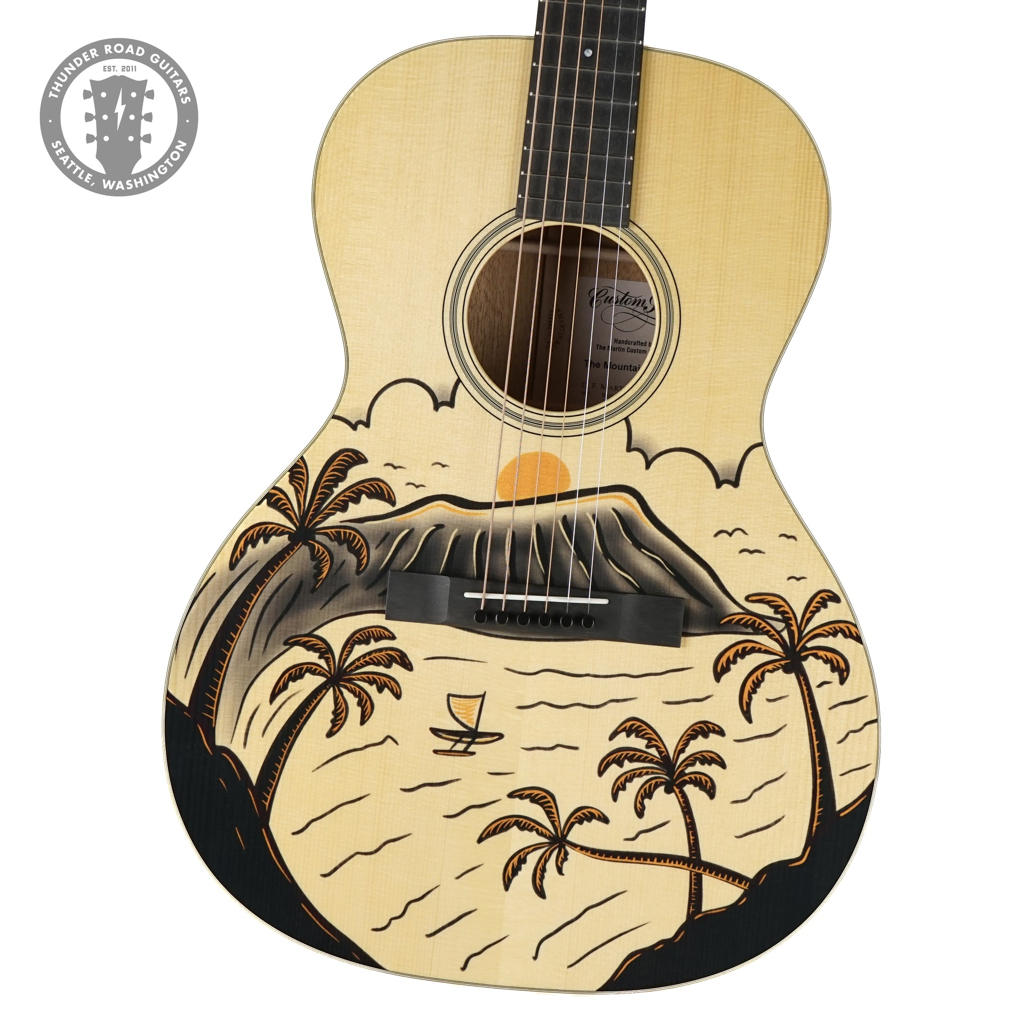 In careful planning with our friends at the Martin Custom Shop we are pleased to offer up the Martin Custom Shop ''00'' Grand Concert Body in Tropical Sunset. These guitars we designed out of are love and admiration for Kel Kroydon branded flat tops from the 1920s and 1930s. This build features: 00 grand concert body size, mahogany back and sides, Adirondack spruce top, Golden Era bracing, Golden Era modified low oval neck shape, custom Tropical Sunset illustration by Aaron Johnson of Pixel & Quill.