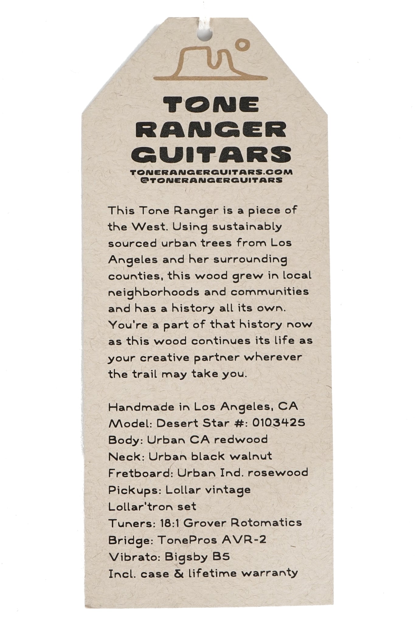 Up for sale is a New Tone Ranger Desert Star # 103425 in Natural. All Tone Ranger Guitars are hand built in Southern California. Weight: 7lbs. 1oz.