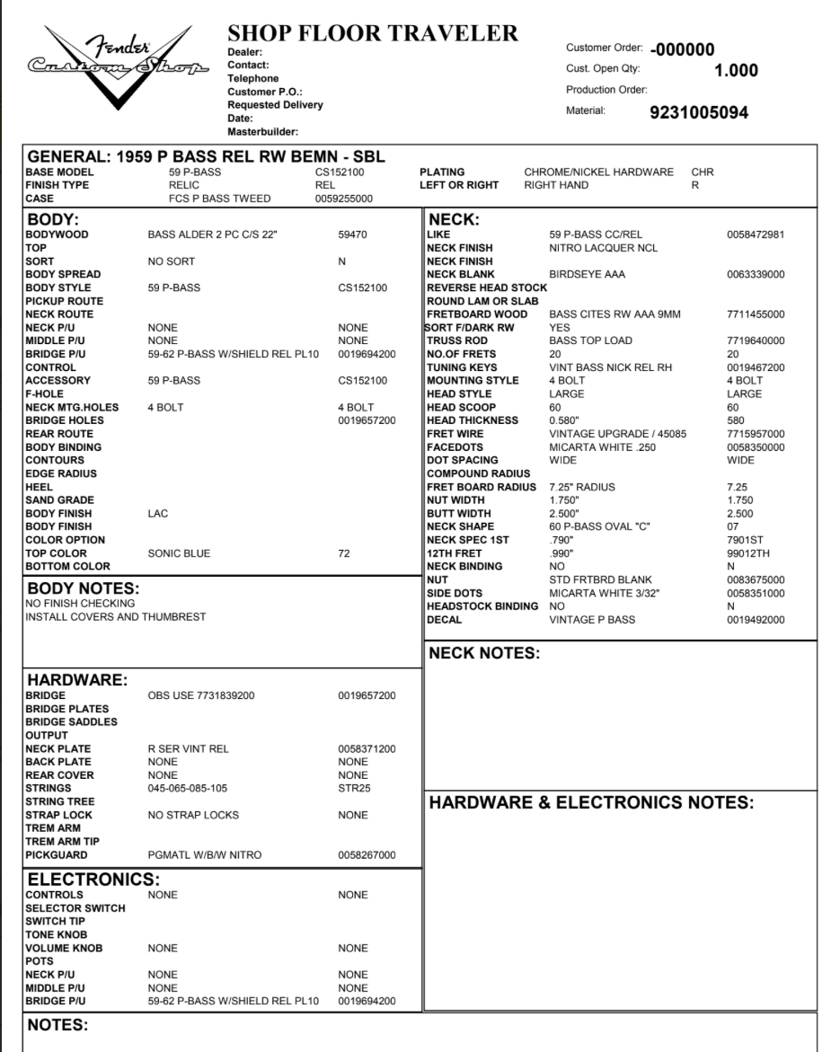 Up for sale is a 2013 Fender Custom Shop 1959 Precision Bass Relic in Sonic Blue. This example is in excellent factory relic'd condition showing no wear aside from what was done at the custom shop. We are an authorized Fender Custom Shop Showcase Dealer and have one of the largest selections of Fender Custom Shop instruments in the Pacific Northwest. For a full list of specs please see the build sheet photo in our ad. Pro setup in house and comes complete with its original hard case and paperwork, sans the COA. We can order a replacement COA from Fender to the buyer of this instrument at no charge. Weight: 8lbs. 6oz.